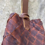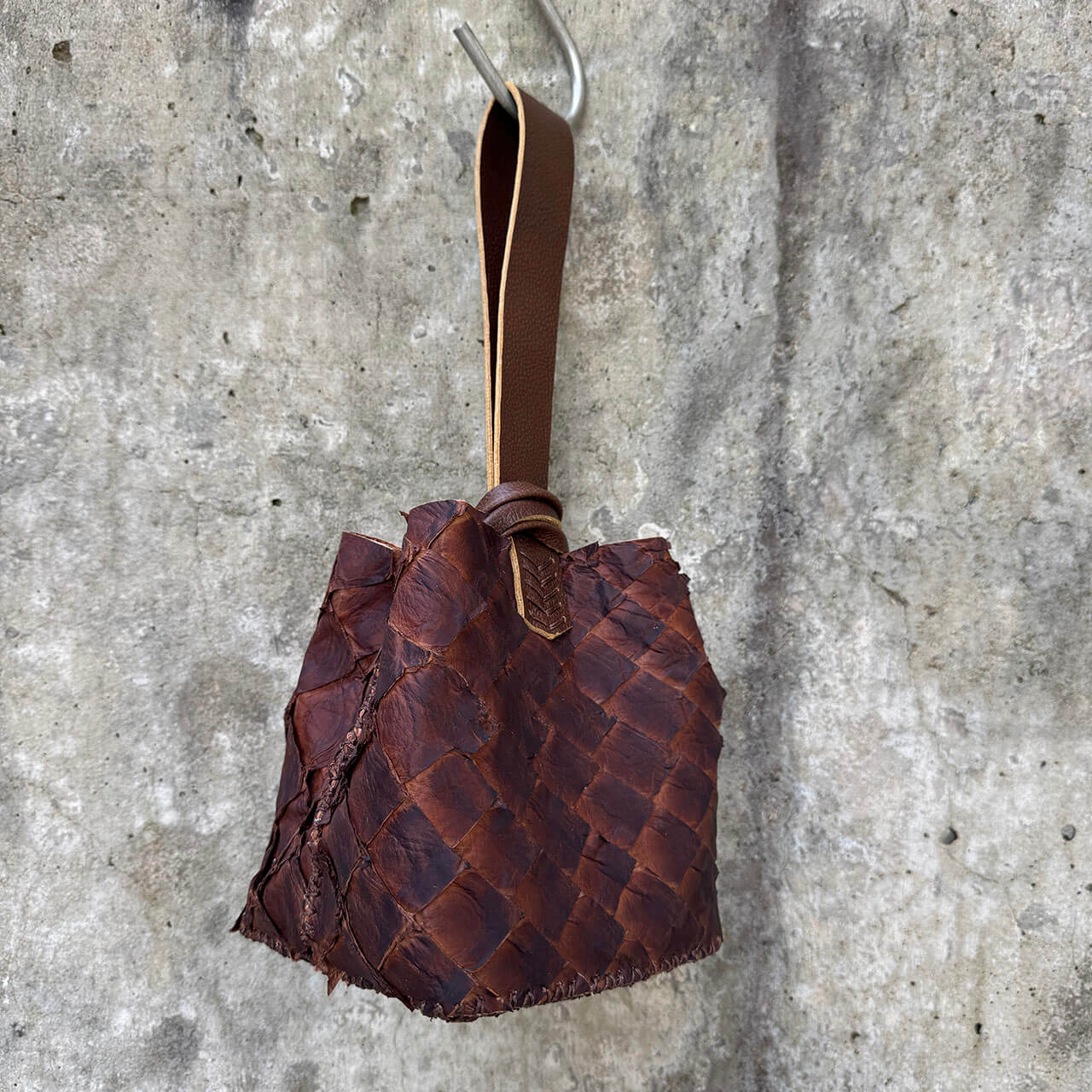 Bolsa pequena em couro macio upcycled (reaproveitamento) e couro de pirarucu, silhueta simplificada, fluída, atemporal.
