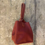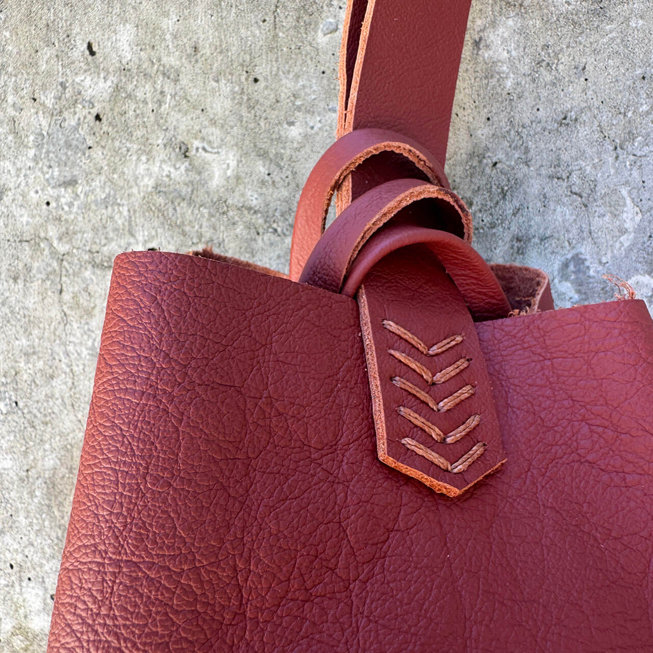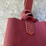 Bolsa pequena em couro macio upcycled (reaproveitamento) e couro de pirarucu, silhueta simplificada, fluída, atemporal.