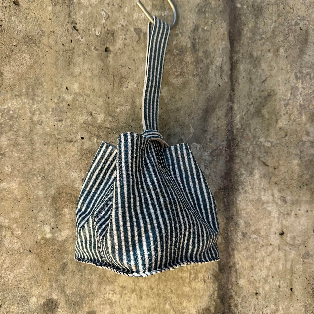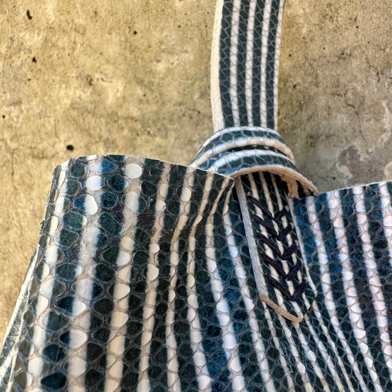 Bolsa pequena em couro macio upcycled (reaproveitamento) e couro de pirarucu, silhueta simplificada, fluída, atemporal.