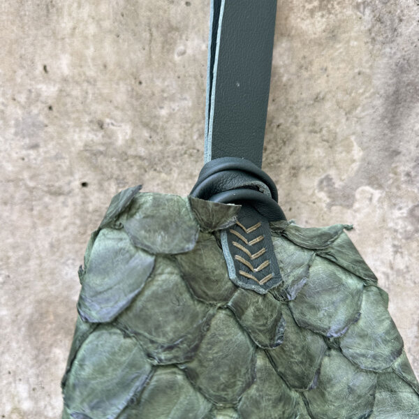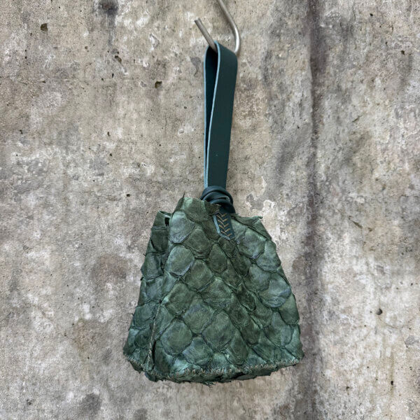 Bolsa pequena em couro macio upcycled (reaproveitamento) e couro de pirarucu, silhueta simplificada, fluída, atemporal.