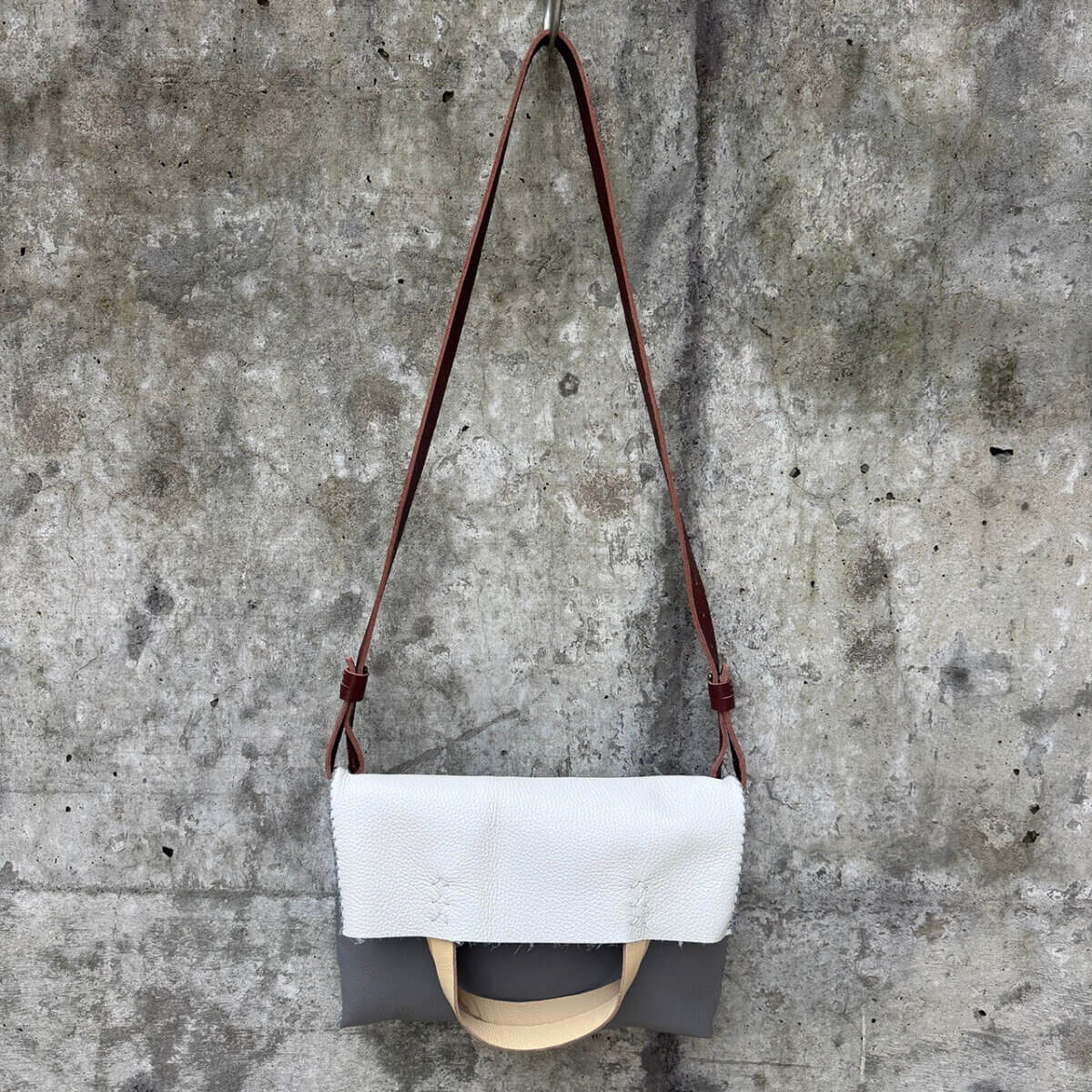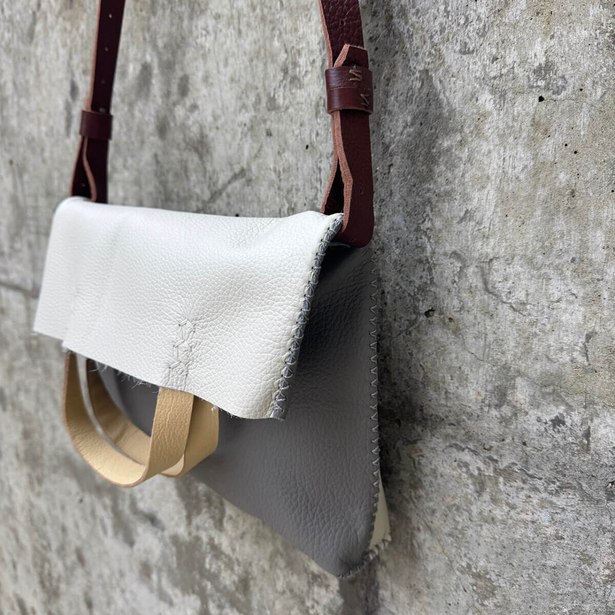 Bolsa média em couro macio upcycled (reaproveitamento), silhueta simplificada, fluída, atemporal.